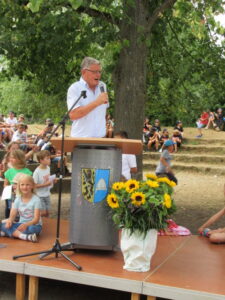 Ein Höhepunkt des Bühnenprogramms war die symbolische Scheckübergabe des am Spendenlauf erzielten Betrags für notleidende Menschen in der Ukraine. Das leibliche Wohl kam natürlich auch nicht zu kurz: ein reichhaltiges Angebot an Kuchen oder auch herzhaften Speisen konnte man auf dem Schulhof genießen.