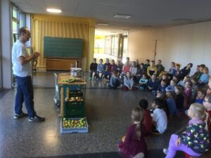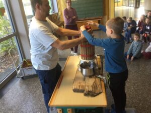 Auch dieses Schuljahr fand wieder für unsere drei ersten Klassen das Apfelpressen-Projekt statt. Die Kinder konnten miterleben, wie aus den von ihnen selbst gesammelten Äpfeln der frisch gepresste, vorzügliche Apfelsaft wurde.