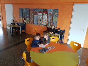 In diesem Schuljahr übernahmen die Kinder der Klasse 2a die Patenschaft für die Klasse 1c. Nach einer Einladung der 2a zum Theaterstück der „Kleinen Raupe Nimmersatt“ revanchierten sich die Erstklässler mit einer herbstlichen Vorlese- und Bastelaktion. Mit großer Freude lasen die Schülerinnen und Schüler der 1c ihren Paten Herbstwörter vor und zeigten so, was sie bereits gelernt hatten. Einfühlsam und engagiert unterstützte dabei jeder Zweitklässler sein Patenkind. Beim anschließenden gemeinsamen Basteln einer Raupe, welche aus einem Apfel spitzt, hatte jedermann viel Spaß. Die Großen halfen den Kleinen, so dass die Bastelarbeiten mit Leichtigkeit fertig gestellt und stolz präsentiert wurden.