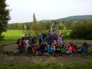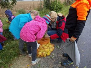 Wir, die beiden zweiten Klassen, starteten am Freitag, den 29.09.2017 zu unserem „Apfelwandertag“. Nicht weit von der Schule, an der Obstbaumallee in Richtung Hollfelderhof, standen „unsere“ ersten Bäume. Doch ganz so einfach wie im letzten Jahr ging es diesmal nicht. Unsere Lehrerinnen und mehrere Praktikantinnen mussten erstmal die Äpfel mit einem langen Stab herunterschütteln. Das war wohl recht anstrengend; auf jeden Fall kamen die „Großen“ dabei ganz schön ins Schwitzen. Als endlich der Startschuss zum Äpfelsammeln gegeben wurde, waren wir kaum noch zu halten. Wir sammelten sehr fleißig: die guten Äpfel kamen in die mitgebrachten Säcke, die unser Hausmeister Jörg Walter später abholen würde, und die faulen Äpfel lagerten wir am Stamm des jeweiligen Baumes.