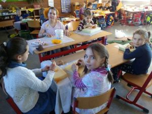 Wir stellten ein Osterei und ein Küken her. Danach filzten wir noch einen Eierbecher und durften alles mit nach Hause nehmen.