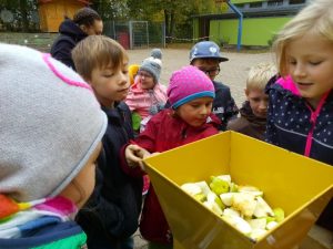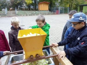 Ein paar Tage nach unserer Apfelsammel-Aktion durften wir unter Anleitung unseres Hausmeisters aus den Äpfeln unseren eigenen Apfelsaft pressen. Zuerst mussten die Äpfel gewaschen und in Stücke geschnitten werden. Dann kamen die Stücke in die Presse und wir brauchten teilweise unsere ganze Kraft, um anschließend den leckeren Saft genießen zu können. Mmmh, sehr fein!