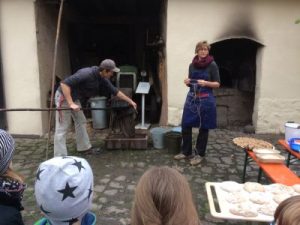 Nun war es aber Zeit, die Brote im historischen Holzofen zu backen. Als endlich die benötigte Backtemperatur im Ofen erreicht war, durften die Kinder die Brotlaibe gemeinsam zum Backofen bringen.