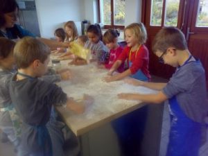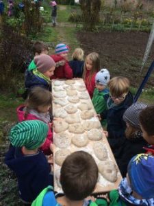 Nach dem kurzweiligen Theorieteil durfte die erste Schülergruppe selbst aktiv sein. Mit Schürzen bekleidet wurden der Teig geknetet, die Laibe individuell geformt und mit verschiedenen Körnern verziert, während die zweite Gruppe eine Brotzeitpause genoss und den Kräutergarten sowie die Ausstellung in der Scheune wie auch das Wohnhaus erkundete.