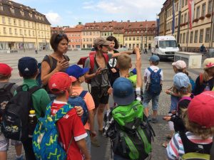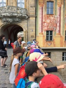 Genau zwei Wochen später durften wir mit den beiden Damen zu einer abenteuerlichen Stadtführung durch Bamberg aufbrechen. Wir erlebten nun viele Schauplätze des Buches (das „Huiping“, den Obst- und Gemüsemarkt, das neue und das alte Rathaus, den Kranen und die Obere Brücke) auf eine ganz andere Art und Weise. Wir rätselten und malten Dinge in die angefangenen Zeichnungen von Frau Bollermann. Außerdem lernten wir sehr viel Interessantes über die schöne Stadt Bamberg.