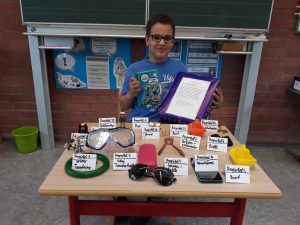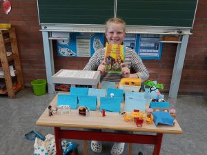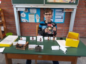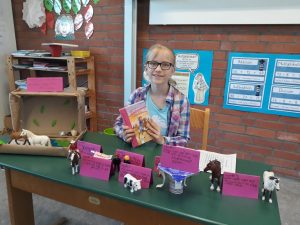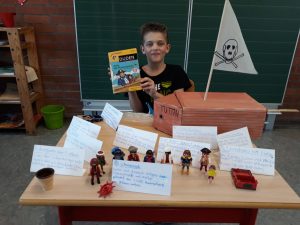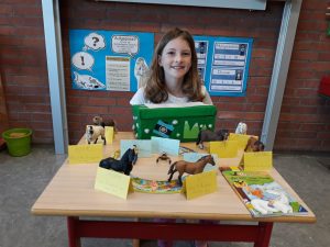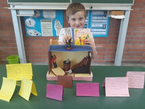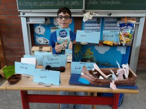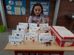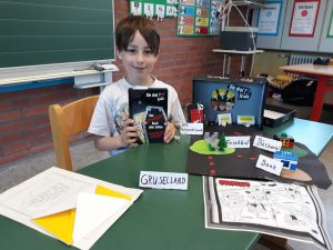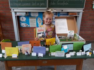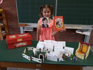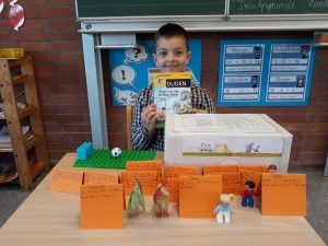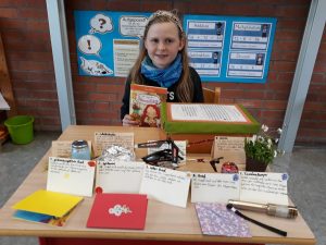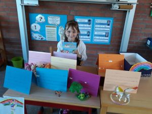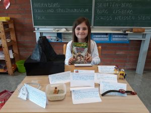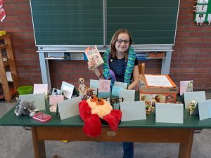 Anhand von selbst gefertigten Aufstellern mit kurzen Informationen zum Inhalt sowie den Gegenständen, erzählten die Kinder den Inhalt ihres Buches.