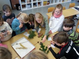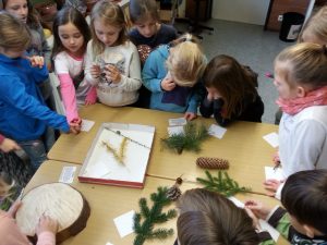 Dazu fanden sich im Klassenzimmer vielfältige Textmaterialien sowie konkrete Anschauungsmaterialien, mit Hilfe derer sich die Kinder einen Überblick über den zu erarbeitenden Lernstoff verschaffen konnten. Das eigens dafür vorhandene Waldbuch bot ferner weitere Unterstützung beim Differenzieren der einzelnen Baumarten.