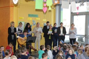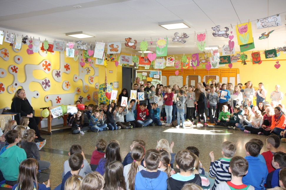 Nach der dritten Stunde versammelte sich die gesamte Schulfamilie in der Aula und stimmten zuerst den Schulsong an. Danach sprach Rektor Dorn Frau Binner seinen Dank für die Treue unserer Schule gegenüber aus und überreichte im Namen aller ein Abschiedsgeschenk.
