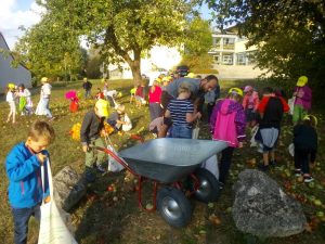 An einem wunderschönen Septembermorgen durften wir die leckeren Äpfel direkt vor unserem Schulhaus ernten. Die beiden Apfelbäume trugen so viele, reife Früchte, dass wir nicht nur unsere Mägen, sondern auch viele Kisten und Säcke füllen konnten.