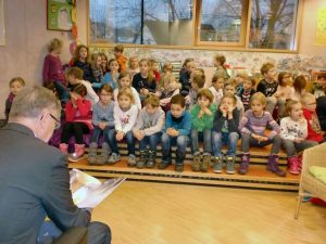 In der Vorweihnachtszeit organisierte Frau Stumpf mit ihrem Büchereiteam eine Vorlesestunde für uns – die beiden ersten Klassen der Grundschule Litzendorf. Trotz seines vollen Terminkalenders, nahm sich Bürgermeister Wolfgang Möhrlein für uns Zeit, um uns ein Bilderbuch vorzulesen. Gespannt lauschten wir der Geschichte „Der kleine Bär und der Weihnachtsstern“. Es war eine wunderbare Geschichte über Einfühlungsvermögen, Behutsamkeit und den Zauber der Weihnachtsnacht. Die Geschichte handelte von einem Fuchs, der in einer frostigen Nacht an der Tür des kleinen Bären anklopfte. Dieser konnte ihn aber nicht hereinlassen, da bereits die verängstigte Gans und das Seidenhuhn bei ihm wohnten. Zum Trost versprach der kleine Bär für den Fuchs den schönsten und hellsten Stern vom Himmel zu holen.