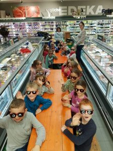 Am 22. November besuchte die Klasse 2c den Edeka-Markt, um beim „Parcours der Sinne“ noch mehr über gesunde Ernährung zu erfahren, zu erschmecken und zu ertasten. Dieser Unterrichtsgang bildete den Abschluss zur Lerneinheit „Gesunde Ernährung“. Die Diätassistentin Frau Anita Beckstein stellte den Jungen und Mädchen nach einer kurzen Begrüßung zunächst verschiedene Obst- und Gemüsesorten vor. Anschließend erklärte sie, welche Bausteine zu einer ausgewogenen Ernährung gehören und dass man auch das Trinken nicht vergessen darf. Im Anschluss schnippelten die Kinder Obst und Gemüse für leckere Salate, welche gemeinsam verzehrt wurden. Große Freude bereitete den Zweitklässlern das blinde Verkosten von Obst und Gemüse. Dazu bekam jeder eine undurchsichtige Brille aufgesetzt, um so das jeweilige Obst- oder Gemüsestück nur am Geruch bzw. am Geschmack zu erkennen. Das war gar nicht so einfach! Zum Abschluss ertasteten die Kinder in einer Fühlbox diverses Gemüse und Obst nur an dessen Form. Mit einem Überraschungsbeutel und einer Urkunde ging es wieder zurück in dies Schule.