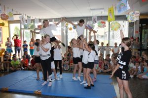 Wie jedes Schuljahr traf man sich zur letzten Unterrichtsstunde in der Aula, um den Schuljahresabschluss gebührend zu feiern. Inhalte waren neben den Ehrungen verdienter Schülerinnen und Schüler auch die Verabschiedung von Kolleginnen, die im kommenden Schuljahr an anderen Schulen tätig sein werden. Aber auch die Viertklässler ließen es sich nicht nehmen mit einer Akrobatikshow ihren persönlichen Abschied zu gestalten.
