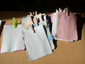 Aus der Wanne, die man „Bütte“ nennt, schöpften wir dann mit einem Schöpfrahmen unsere eigenen Papierbögen. Die Bögen hängten wir zum Trocknen auf einen Wäscheständer.