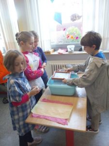 Wir, die Kinder der Klassen 2a und 2b, haben uns in den letzten 3 Tagen mit dem Material „Papier“ beschäftigt. Unsere Lehrerinnen hatten Frau Peters dazu eingeladen. Sie ist eine Expertin auf diesem Gebiet.