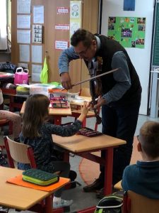 Im Musikunterricht stellte er uns seine Geige vor. Kurzweilig lernten die Kinder die Teile und die Beschaffenheit dieses Saiteninstruments kennen. Darüber hinaus wurde auch vermittelt, wie man auf der Geige hohe und tiefe Töne erzeugen kann. Auch wie der Ton überhaupt von der Geige zu unseren Ohren kommt, wurde von Herrn Kuhnlein anschaulich erklärt. Sehr engagiert versuchten die Kinder auch die gespielten Lieder zu erraten und mitzusingen. So erklangen in den Klassenzimmern Lieder, wie zum Beispiel „Fuchs, du hast die Gans gestohlen“, „Häschen in der Grube“ oder „Hänschen klein“, die die Kinder fleißig mitträllerten. Am Ende begleitete die Geige Herrn Kuhnleins Erzählung von „Dornröschen“. Begeistert nahmen die Kinder wahr, wie man beispielsweise „Schritte“, „den Wind“, „das Blinzeln“ oder „eine quietschende Tür“ mit Hilfe dieses Saiteninstruments nachahmen kann.