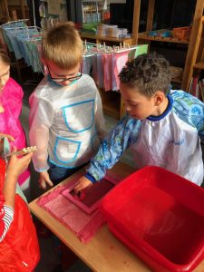 Dazu brauchten wir viele Papierschnipsel, die über Nacht in Wasser eingeweicht waren. Es entstand ein Papierbrei, den man „Pulpe“ nennt. Die Pulpe wurde mit Wasser vermischt und in eine Wanne geschüttet.