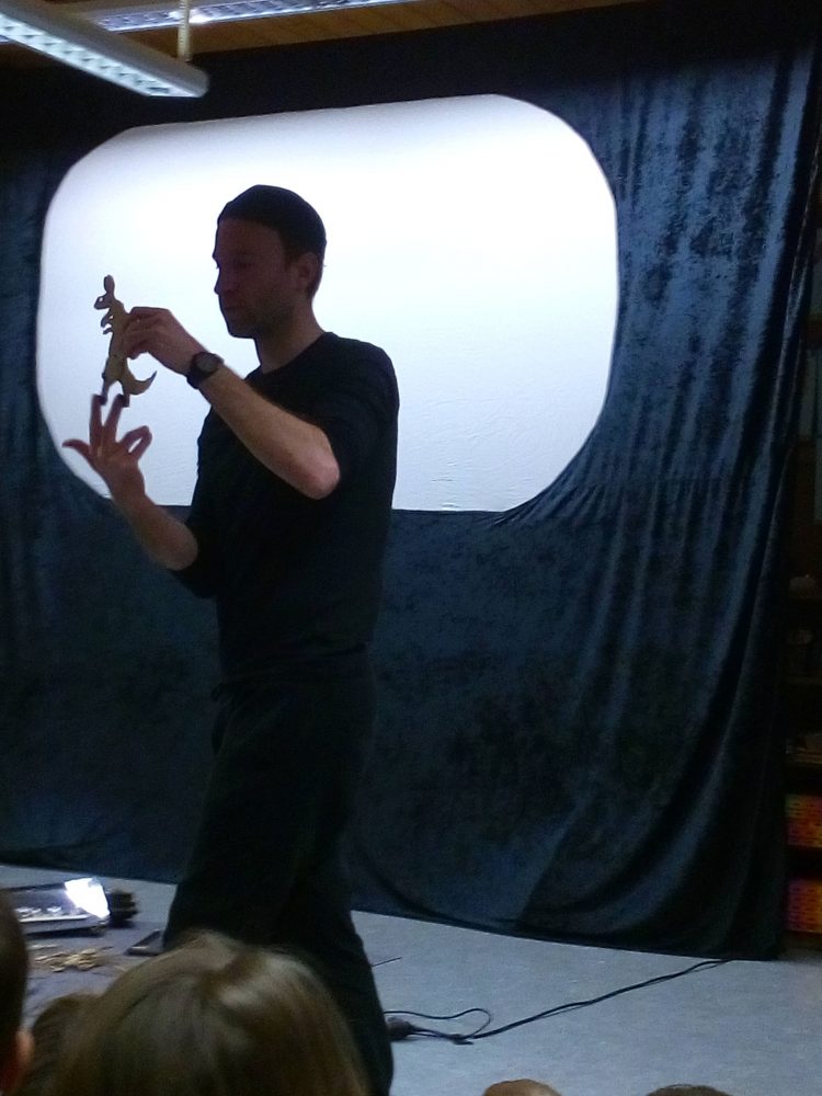 Im Anschluss an das Schattentheater durften die Kinder viele Fragen stellen. Ganz besonders interessierte sie die technische Umsetzung. Frederic Heisig zeigte geduldig alle seine (größtenteils selbst gebauten) Figuren und erklärte viele Zusammenhänge und Details.