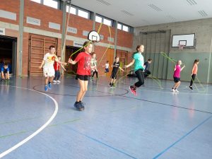 Am Dienstag, 22.10.2019 nahm die Klasse 3c mit großer Freude am Projekt „Skipping Hearts“ der Deutschen Herzstiftung teil. Nach rund 90 Minuten hatte die Trainerin, Frau Hess, mit den Kindern eine kurzweilige Präsentation erarbeitet, die nach der Pause den anderen Klassen sowie den Eltern und Großeltern vorgeführt wurde. Eines war am Ende klar – die Schüler wollen auch weiterhin zuhause und im Sportunterricht ihre Seilspring-künste verbessern bzw. perfektionieren!