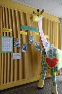 Eine überlebensgroße Giraffe aus Pappmaché, gefertigt während der Projekttage im Schuljahr 2015/2016 ist nicht nur ein Blickfang für alle Besucher, sondern weist auch auf das Angebot an unserer Schule hin, Konflikte zu befrieden durch gewaltfreie Kommunikation. Als Landtier mit dem größten Herzen steht die Giraffe als Symbolfigur dafür.