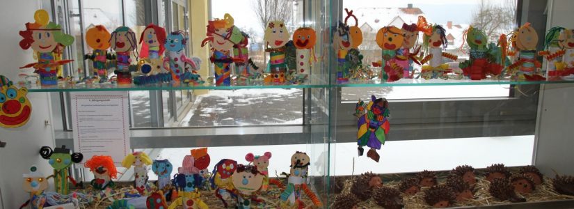 Entlang der Wände, in Schaukästen und auf Tischen können sich Groß und Klein am Betrachten von wechselnden Beiträgen aus dem Kunst- und Werkunterricht erfreuen.