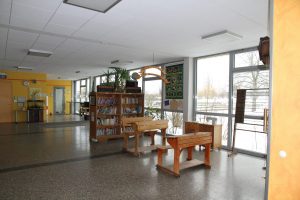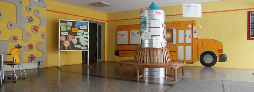 Gleich nach der Eingangstür lädt unser Schulfamilienbus mit der Ruhebank und der Lies-was-Säule zum Verweilen ein. Hier finden sich aktuelle Klassenfotos, Nachrichten aus dem Schulleben und den Schulversammlungen sowie Informationen für die Eltern.
