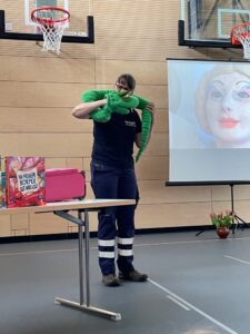 Am 20.März 2024 fand in der Ellertalturnhalle für unsere Erstklässler die Puppen-Comedy-Lesung „Das kleine ABC gegen Stress“ statt. Die erfahrene Notärztin, Kinderbuchautorin und Puppenspielerin Frau Dr. Sibylle Mottl-Link präsentierte dabei auf humorvolle Weise unsern Schülern und auch den eingeladenen Eltern wertvolle Tipps für mehr Gelassenheit und wie man mit einfachen Mitteln wirksam gegen Stress vorgehen kann. Diese Veranstaltung war daher nicht nur unterhaltsam, sondern auch lehrreich.