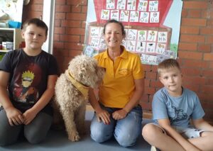 Zusammen mit seinem Frauchen, Frau Rotschka schenkt er Kindern jeden Mittwochnachmittag Zeit. Mit Enzo lernen die Kinder Hemmungen beim Vorlesen abzubauen und Freude am Lesen zu entdecken.