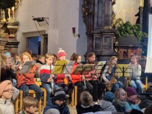 Ein Höhepunkt des Weihnachtsmarktes war auch der Auftritt unseres Schulchors und der Bläserklasse am Sonntag in der Kirche. Unter dem Motto „Die Weihnachtsgeschichte vom kleinen Trommler“ präsentierten die Schüler eine tolle Darbietung, die mit gesanglichen Einschüben des Chors und der Bläserklasse untermalt wurde. Wir möchten uns ganz herzlich bei Herr Wolfgang Bottler für die musikalische Begleitung am Keyboard bedanken, ebenso bei den beiden Leiterinnen der Bläserklasse, Judith Bottler und Martina Hirschlein, für ihre hervorragende Arbeit mit den Schülerinnen und Schülern.